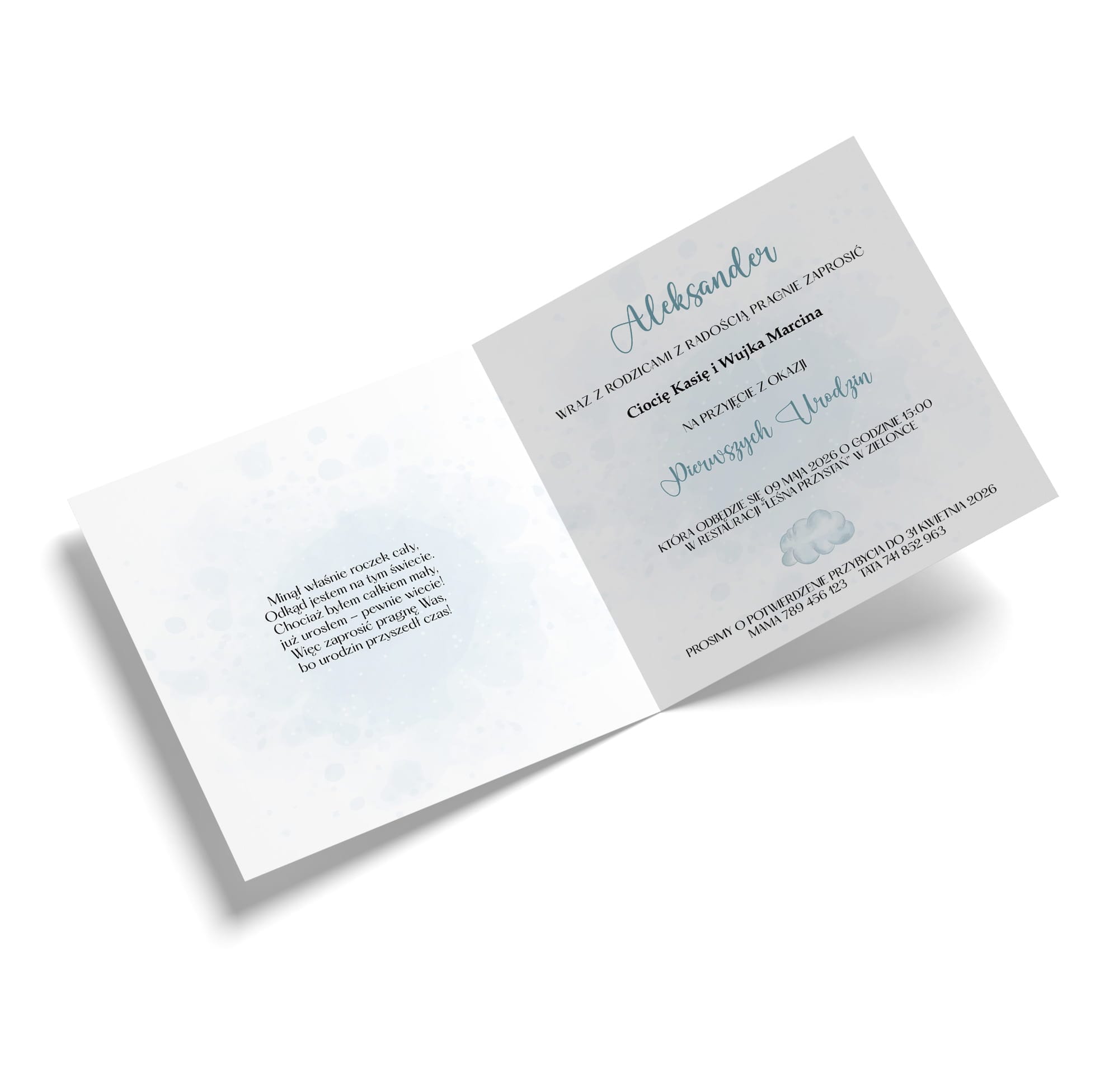 Pastelowa kolorystyka, miękkie niebieskie tony, złote gwiazdki i subtelna grafika tworzą ciepły i przyjazny projekt, idealny zarówno dla chłopca, jak i dziewczynki. Personalizowany nadruk z imieniem dziecka sprawia, że zaproszenie staje się wyjątkową pamiątką.