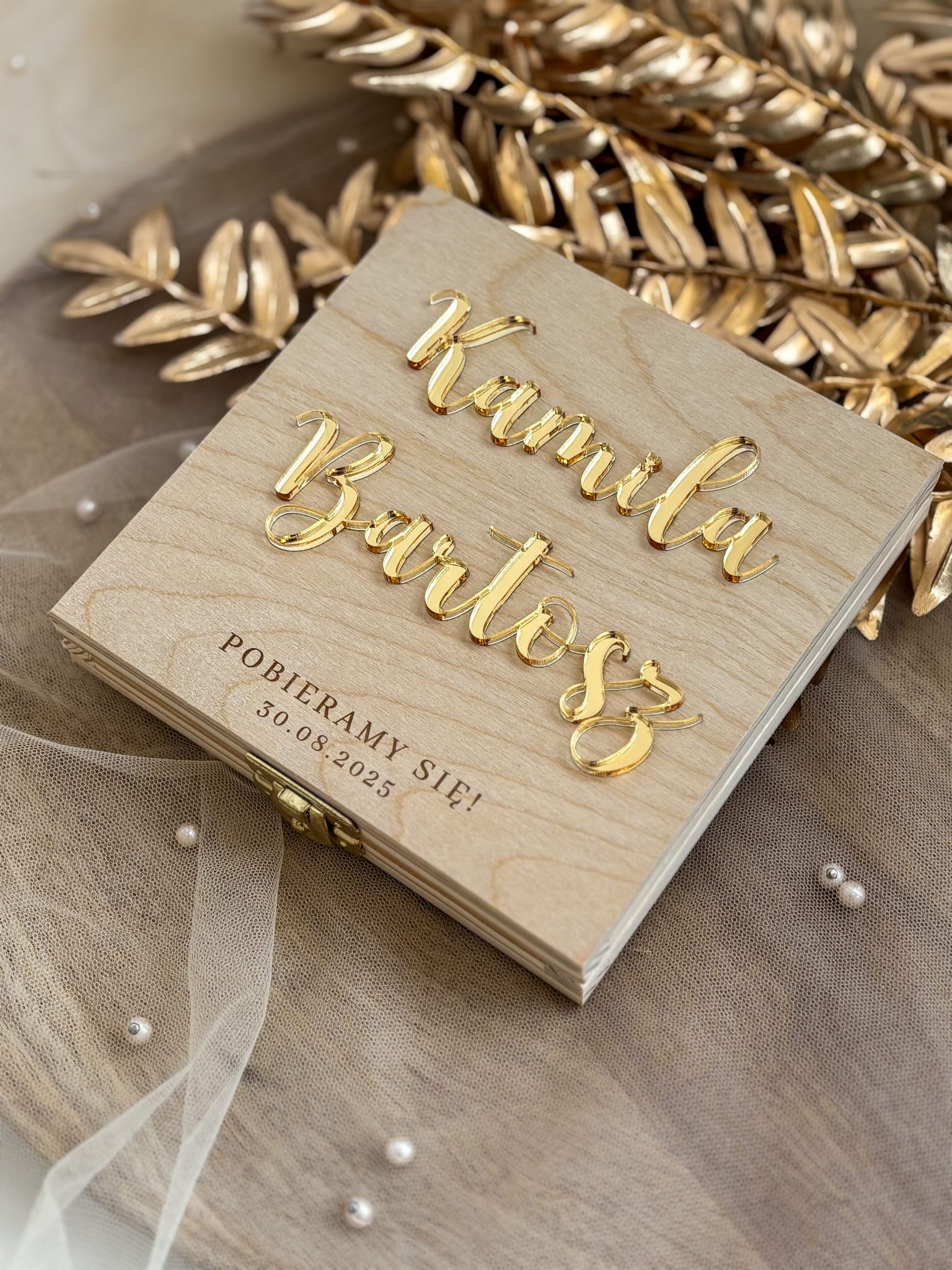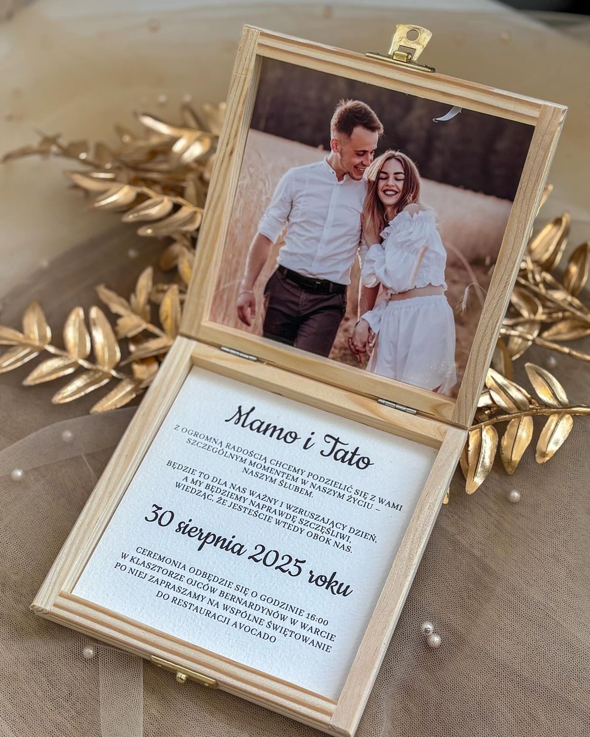 To wyjątkowa forma zaproszenia, która od razu robi wrażenie. Drewniane pudełko prezentuje się elegancko i naturalnie, a po otwarciu odsłania Wasze wspólne zdjęcie oraz pięknie przygotowaną treść. Na wieczku umieszczamy personalizowany napis, dzięki czemu całość nabiera jeszcze bardziej osobistego charakteru.