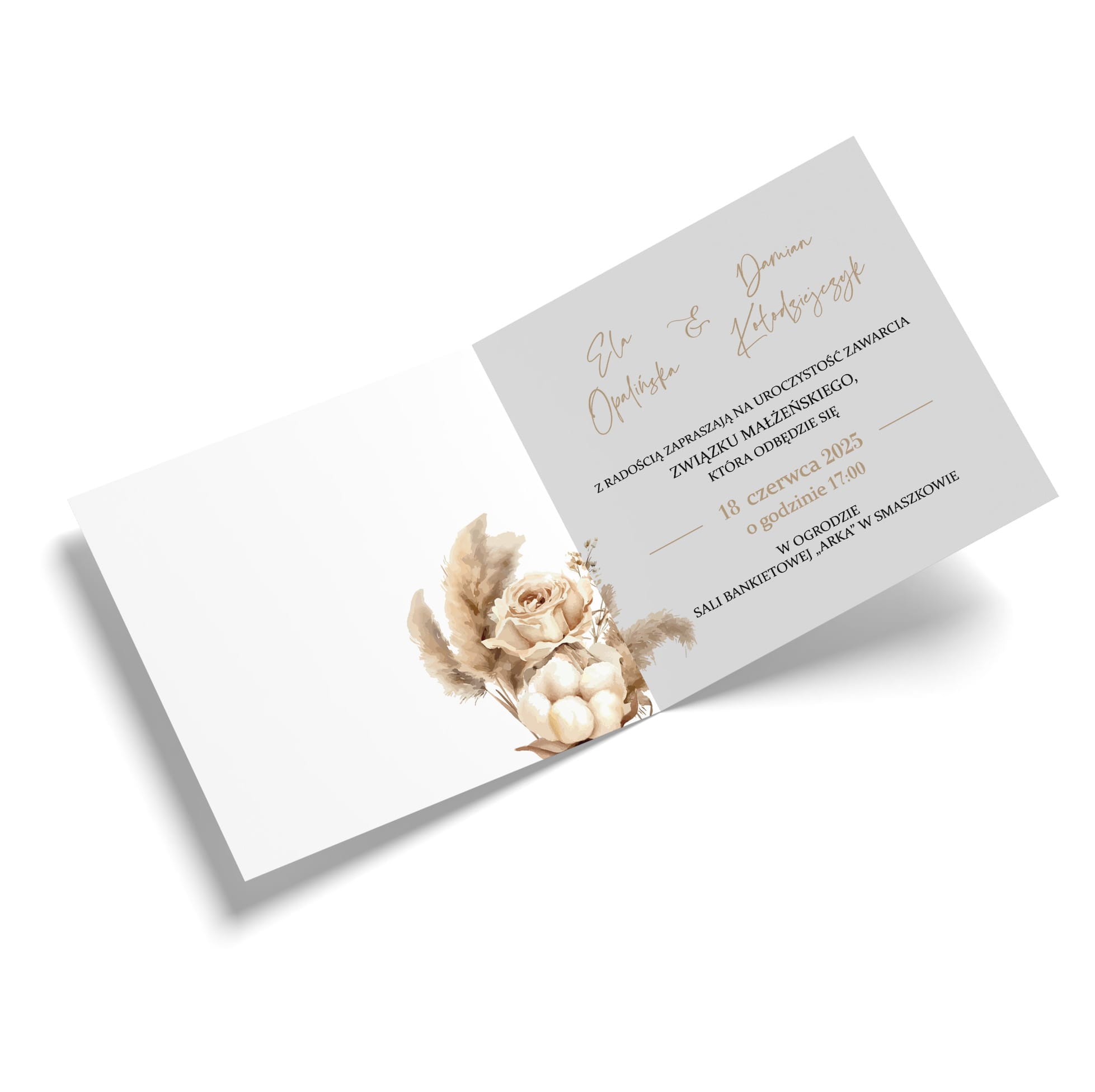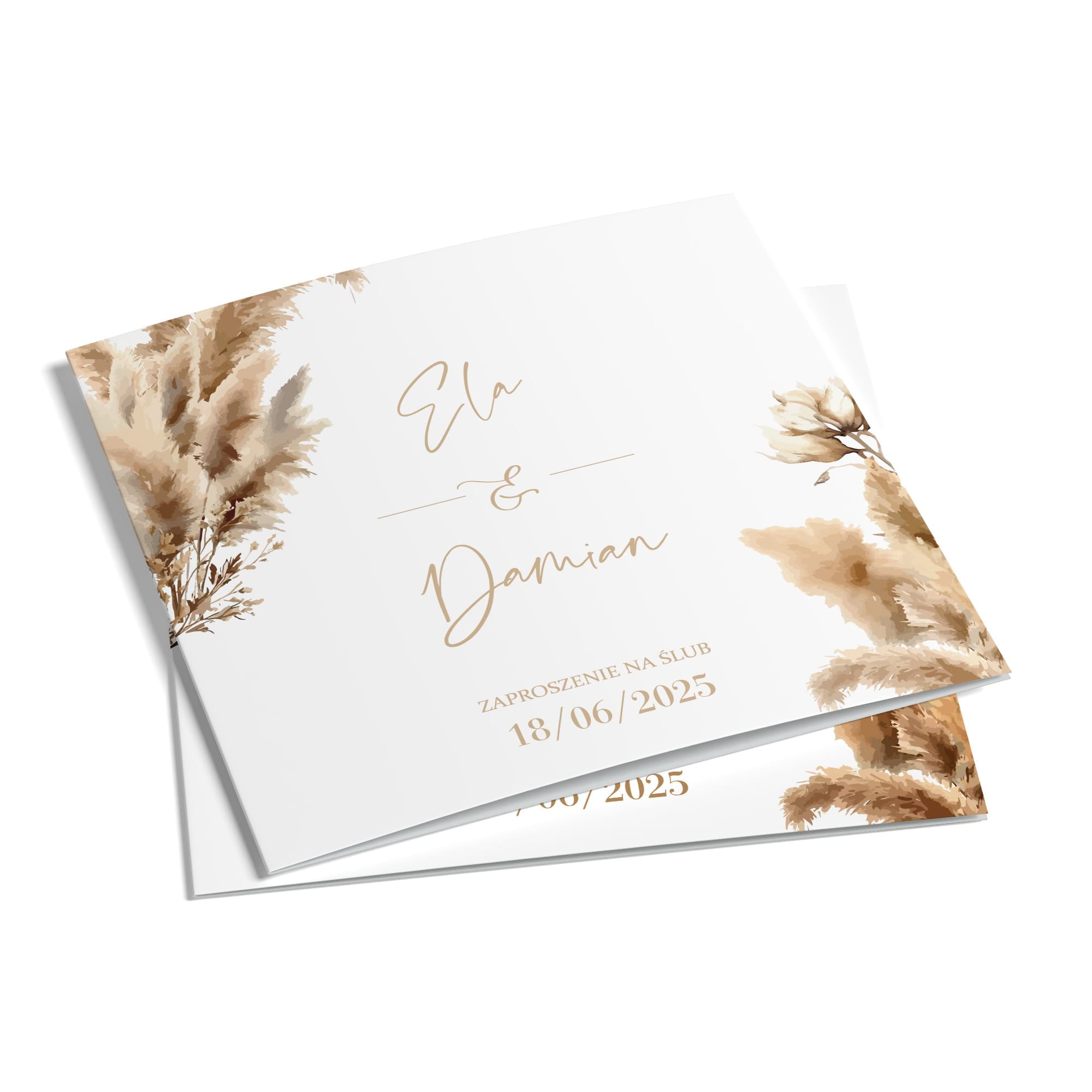 Stylowe, składane zaproszenie ślubne w kolorach ziemi z malarskim motywem traw pampasowych, bawełny i róży. Utrzymane w odcieniach beżu, karmelu i delikatnych brązów, tworzy niezwykle naturalną, ciepłą i romantyczną oprawę dla tak ważnej chwili. Minimalistyczny projekt łączy nowoczesną elegancję z subtelnym klimatem boho.