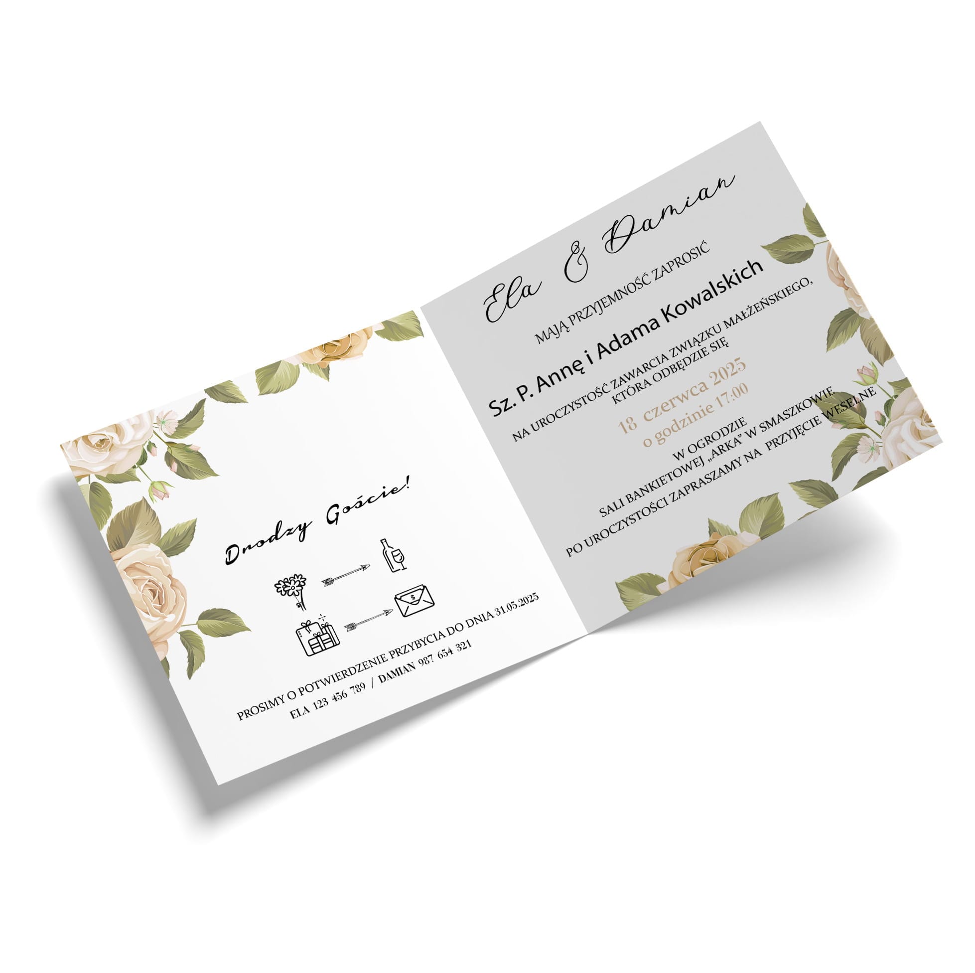Personalizacja: imiona, data, treść, miejsce uroczystości i wesela, RSVP