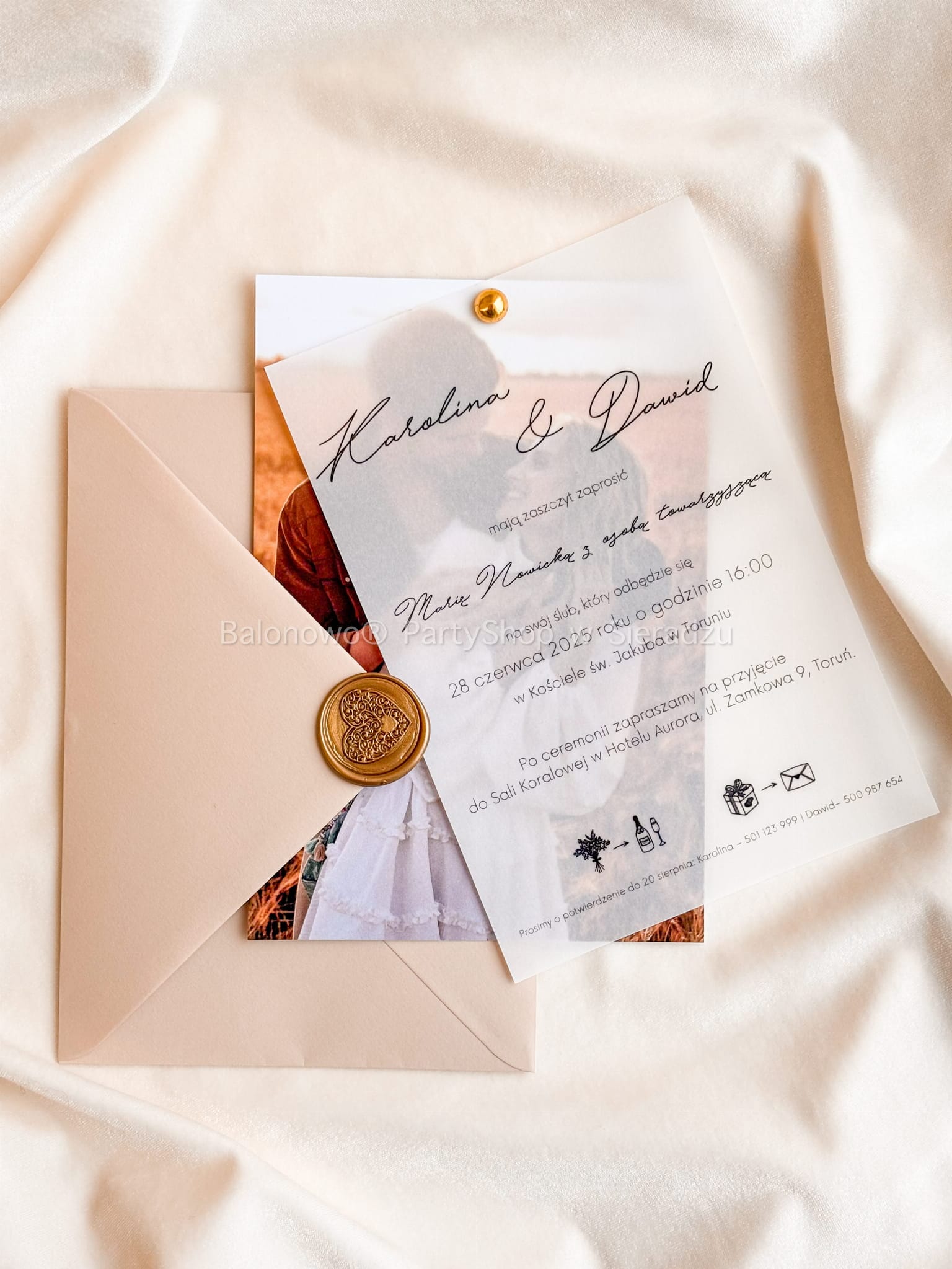 Zaproszenie ślubne z kalką to idealna propozycja dla par, które szukają połączenia nowoczesności z romantyzmem. Przezroczysta karta z nadrukiem delikatnie odsłania kartę ze zdjęciem Pary Młodej, tworząc efekt warstwowości i głębi. Elementy zaproszenia połączone są estetycznym, złotym nitem, a całość dopełnia koperta w odcieniu nude z ozdobną pieczęcią lakową w kształcie serca.