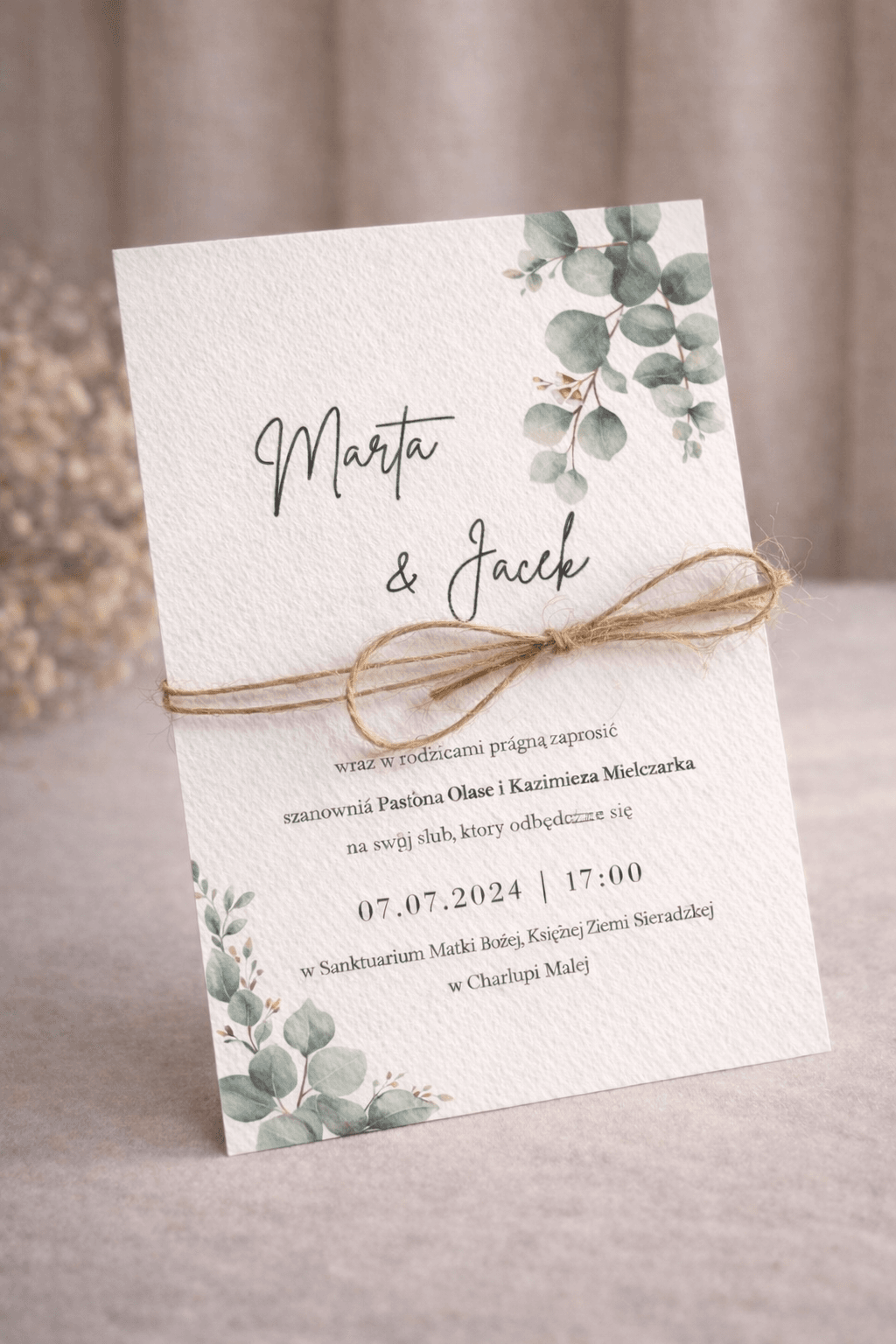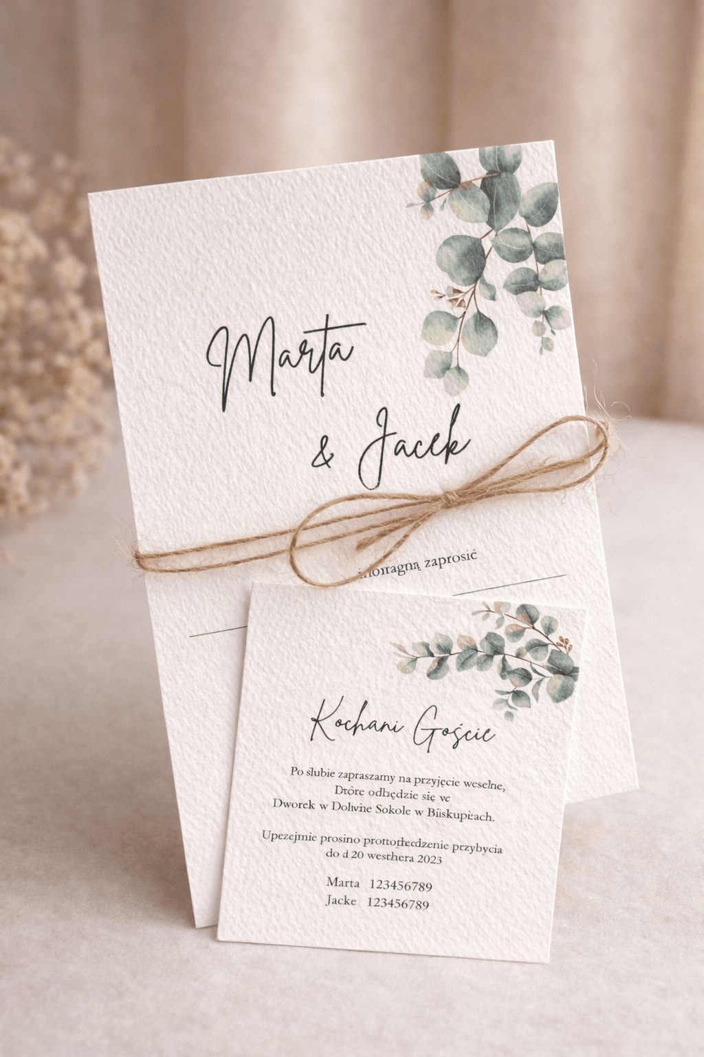 Cały komplet został przewiązany jutowym sznurkiem, który nadaje zaproszeniu lekkości i ręcznie wykończonego charakteru. Dodatkowa karta RSVP sprawia, że zaproszenie jest nie tylko ładne, ale też praktyczne. To model, który dobrze prezentuje się już przy pierwszym kontakcie i od razu buduje klimat uroczystości. Zaproszenie ślubne z eukaliptusem będzie świetnym wyborem dla osób, które chcą połączyć prostotę, elegancję i modny roślinny motyw.